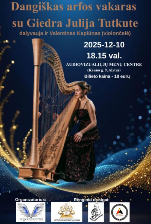 Vakaro metu skambės vieno seniausių pasaulyje instrumentų – arfos – muzika, kurią atliks Giedra Julija Tutkutė. Tai išskirtinio meistriškumo virtuozė, daugybės tarptautinių konkursų laureatė, baigusi 2025 m. Nacionalinę M. K. Čiurlionio menų mokyklą. Kartu keletą kūrinių atliks vakaro svečias violončelininkas Valentinas Kaplūnas, kuris daugiau nei 60 m. vis dar jaunatviškai keliauja su neišskiriama drauge – violončele, nenustodamas puoselėti savo muzikinio talento.