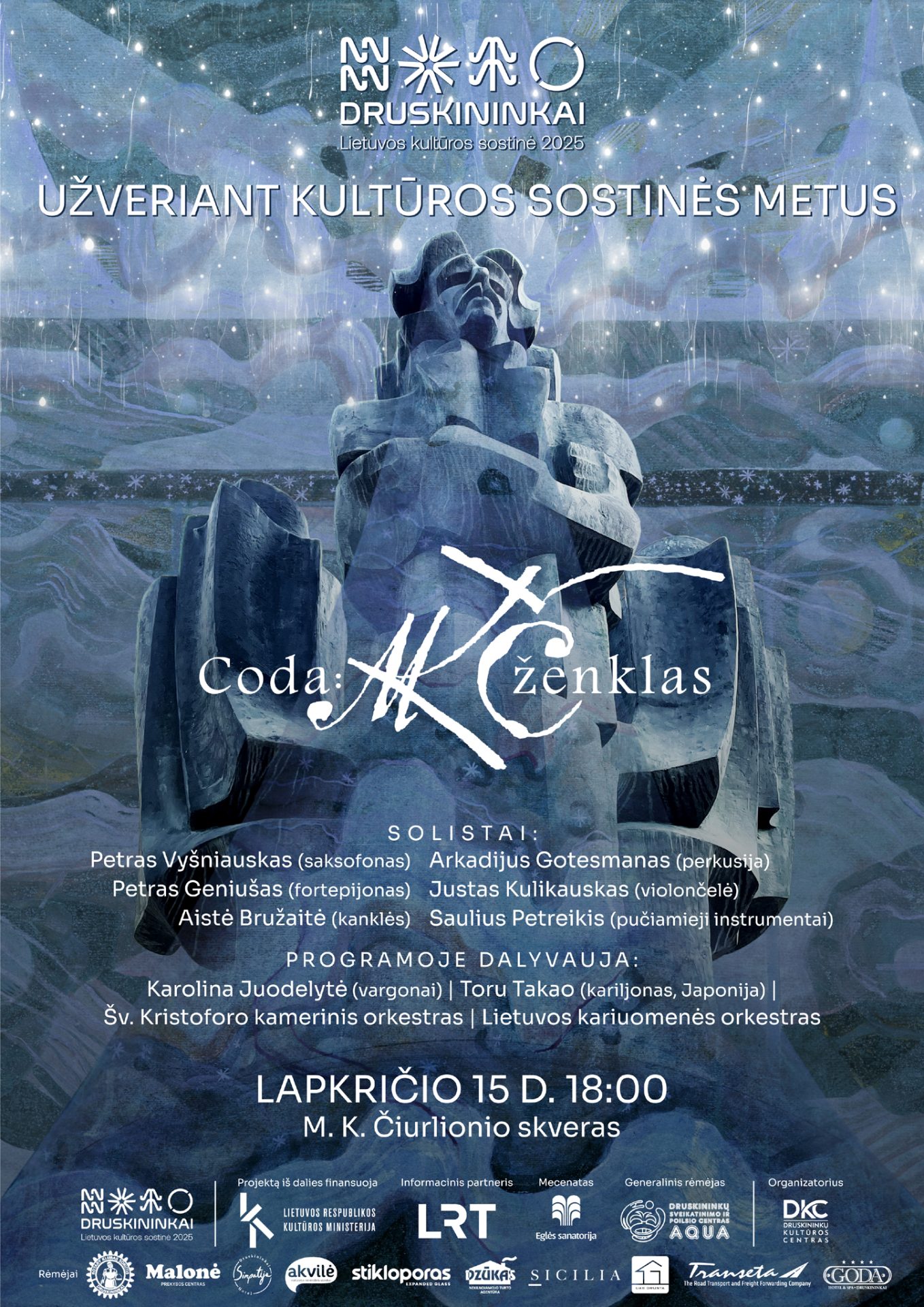 Druskininkai šiais metais gyveno kultūros ritmu – koncertais, parodomis, performansais, diskusijomis, meno akcijomis ir šimtais susitikimų, kuriuose skambėjo Mikalojaus Konstantino Čiurlionio dvasia. Lapkričio 15 dieną, 18.00 val. simboliškai prie skulptoriaus Vlado Vildžiūno sukurto M. K. Čiurlionio paminklo, renginiu „Coda: MKČ ženklas“ bus užverti kultūros sostinės metai Druskininkuose.