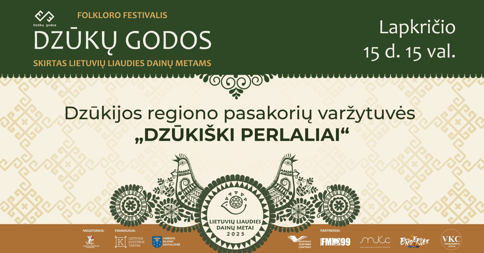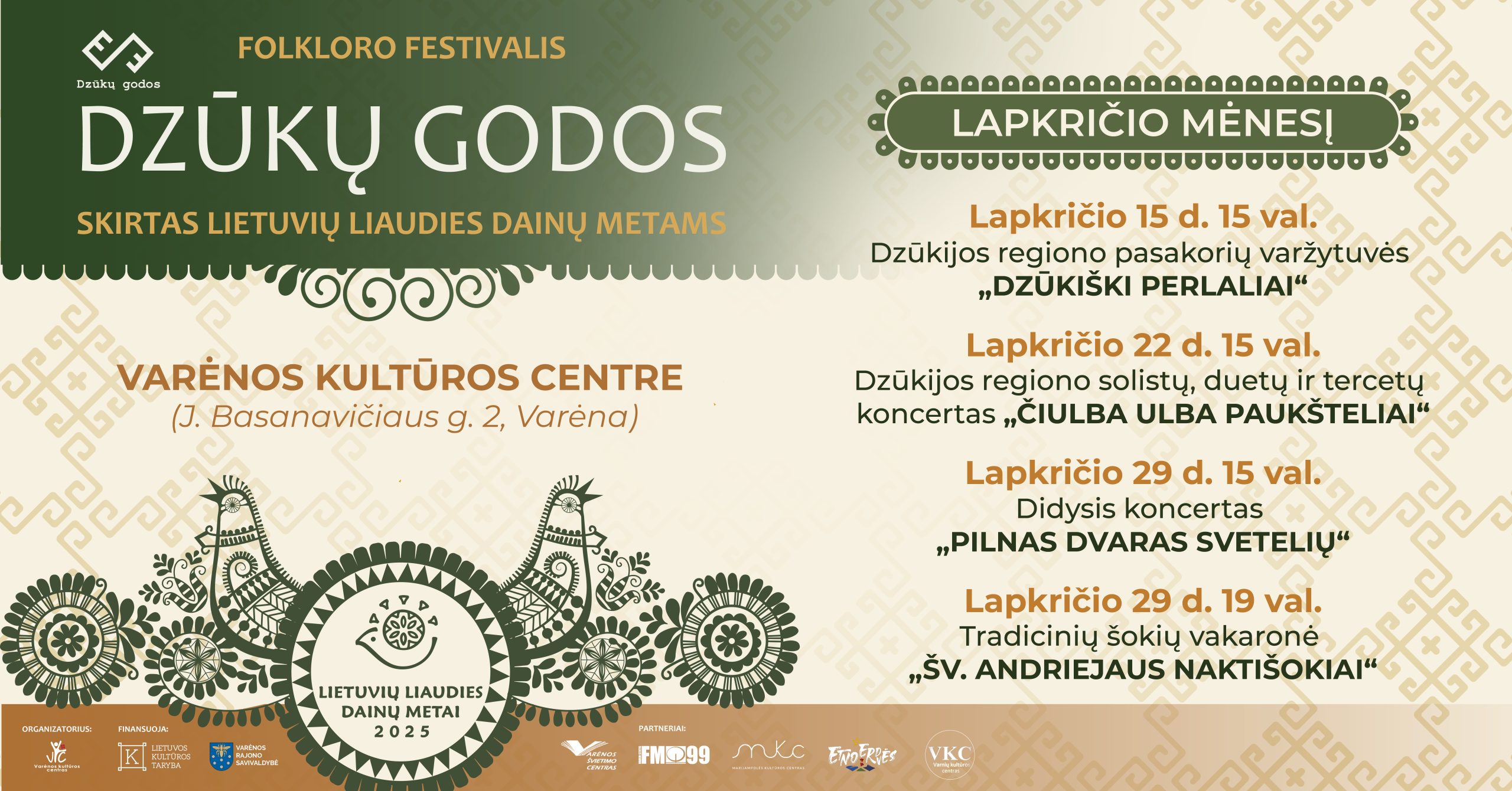 Lapkričio 15 d. 15 val. Dzūkijos regiono pasakorių varžytuvės „DZŪKIŠKI PERLALIAI“. Varžytuvėmis siekiame pasakojamosios tautosakos pagalba atskleisti dzūkų dainininkų gyvenimo istorijas, puoselėti etninės kultūros tradiciją – pasakojamąją tautosaką ir tarmes, ugdyti įvairaus amžiaus tautosakos atlikėjus – pasakotojus bei paskatinti domėtis savo šeimos bei krašto istorija.