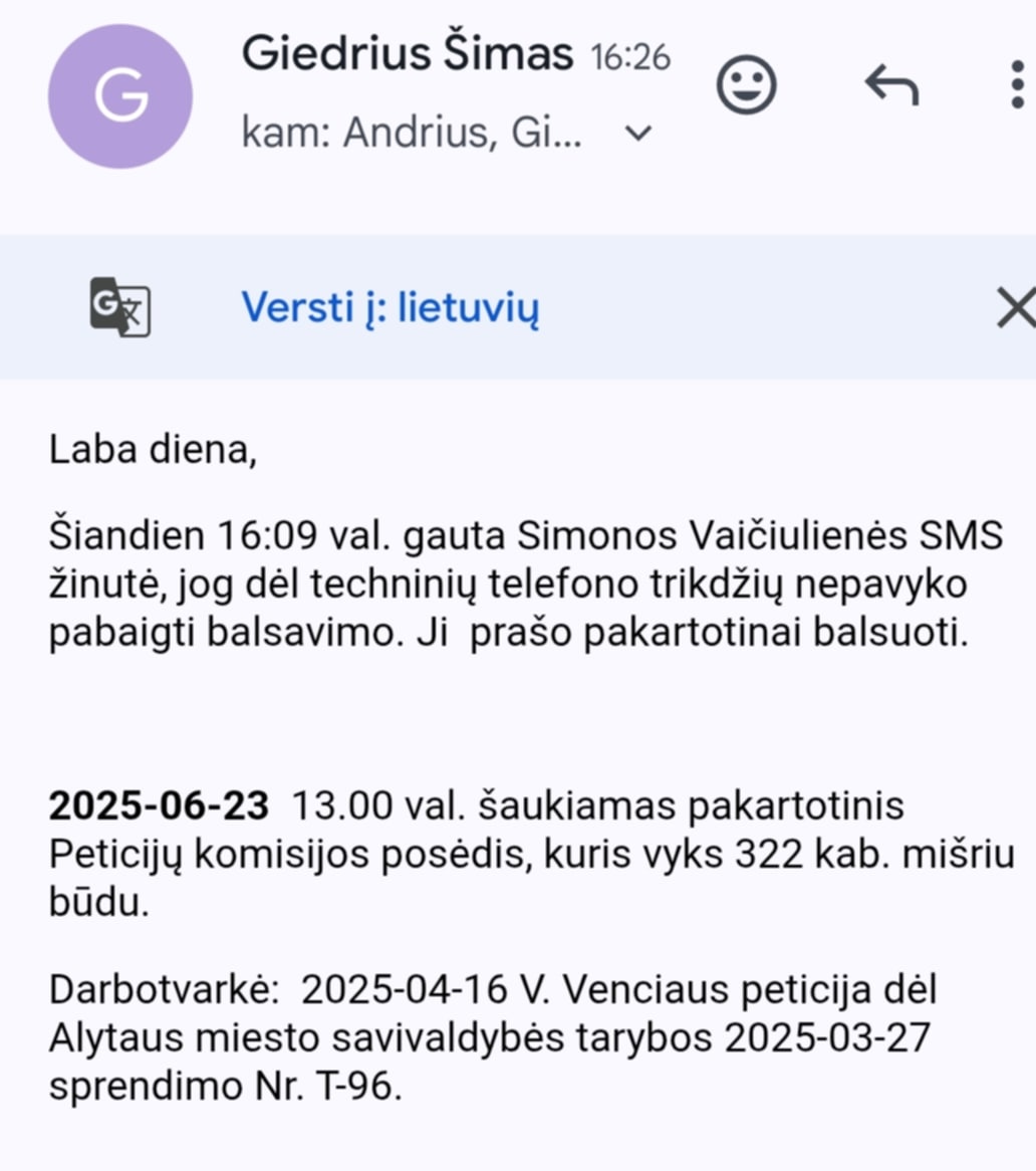 Jau pasibaigus komisijos posėdžiui tą patį vakarą Peticijų komisijos nariai gavo Giedriaus Šimo laišką, kuriame teigiama, kad gauta socialdemokratės Simonos Vaičiulienės SMS žinutė, jog dėl techninių kliūčių jai nepavyko pabaigti balsavimo ir šaukiamas pakartotinis komisijos posėdis birželio 23 dieną.
