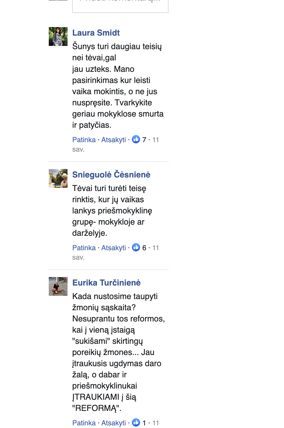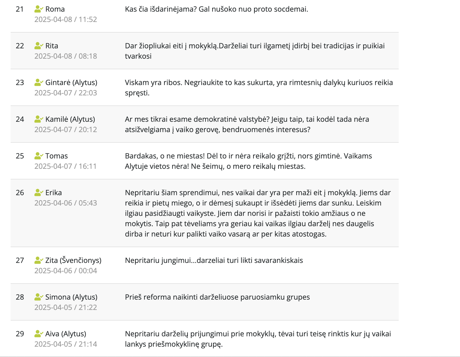 Pasirašydami peticiją alytiškiai negailėjo ir komentarų: „Ar mes tikrai esame demokratinė valstybė? Jeigu taip, tai kodėl tada nėra atsižvelgiama į vaiko gerovę, bendruomenės interesus?“, „Bardakas, o ne miestas! Dėl to ir nėra reikalo grįžti, nors gimtinė. Vaikams Alytuje vietos nėra! Ne šeimų, o mero reikalų miestas.“, „Nepritariu šiam sprendimui, nes vaikai dar yra per maži eit į mokyklą. Jiems dar reikia ir pietų miego, o ir dėmesį sukaupt ir išsėdėti jiems dar sunku. Leiskim ilgiau pasidžiaugti vaikyste. Jiem dar norisi ir pažaisti tokio amžiaus o ne mokytis. Taip pat tėveliams yra geriau kai vaikas ilgiau darželį nes daugelis dirba ir neturi kur palikti vaiko vasarą ar per kitas atostogas.“