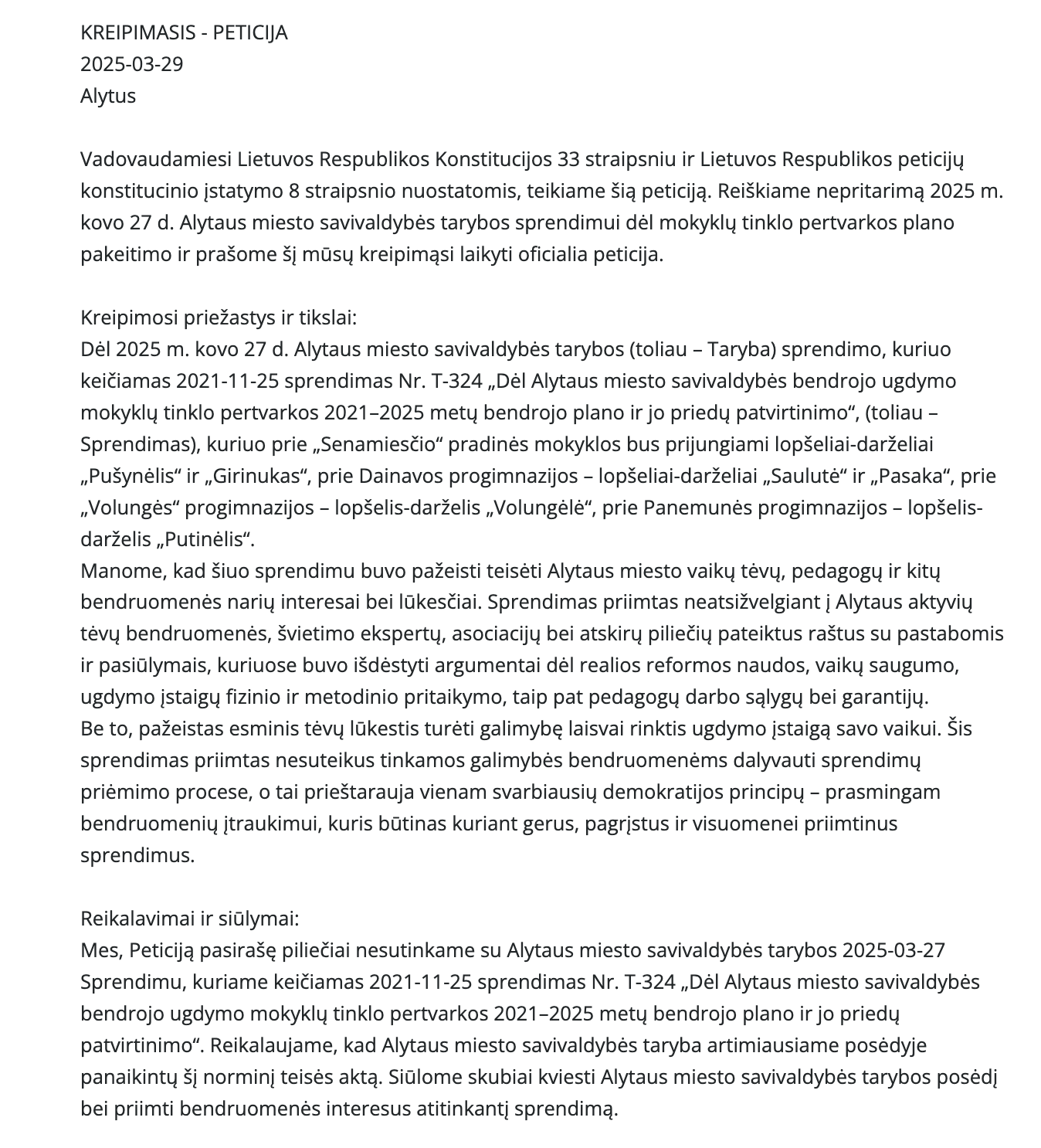 Šiandien, birželio 18-ąją posėdžiavusi Alytaus miesto savivaldybės Peticijų komisija pritarė peticijai, kuria reikalaujama panaikinti tarybos sprendimą jungti Alytaus lopšelius-darželius prie mokyklų be tinkamo bendruomenės įtraukimo ir argumentuotos naudos.