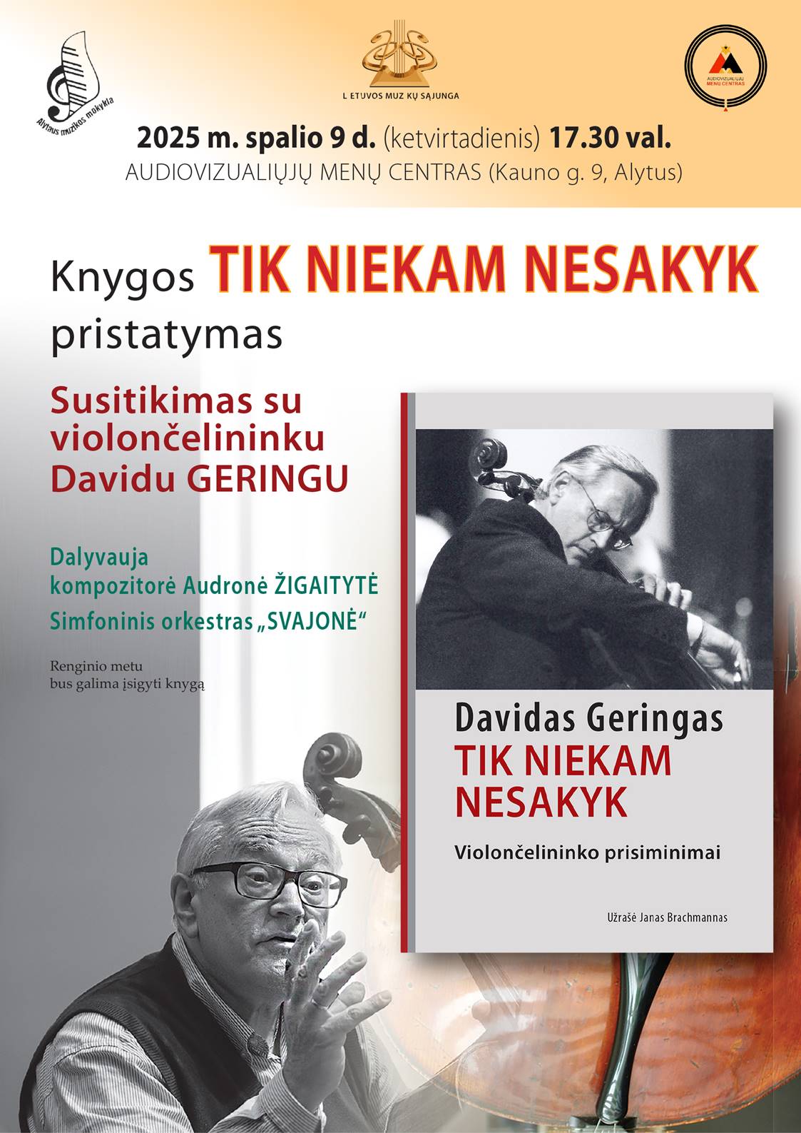17.30 val. Audiovizualiųjų menų centre (Kauno g. 9, Alytus) – knygos „TIK NIEKAM NESAKYK“ pristatymas ir susitikimas su violončelininku Davidu Geringu.
