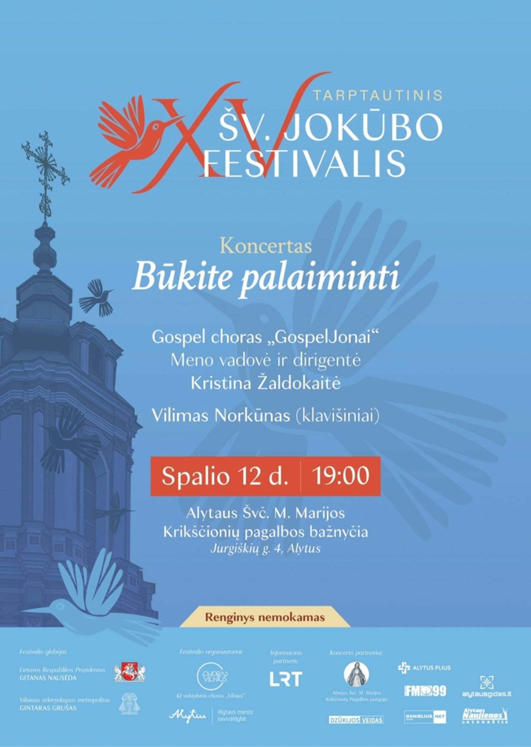 19 val. Alytaus Švč. Mergelės Marijos Krikščionių Pagalbos bažnyčioje (Jurgiškių g. 4) XV Tarptautinio Šv. Jokūbo festivalio metu bažnyčią pripildys šiluma, galia ir tikėjimu alsuojančios giesmės. Skambės gospel choro „GospelJonai“ koncertas „Būkite palaiminti“. Dirigentė – Kristina Žaldokaitė. Klavišiniai – Vilimas Norkūnas.
