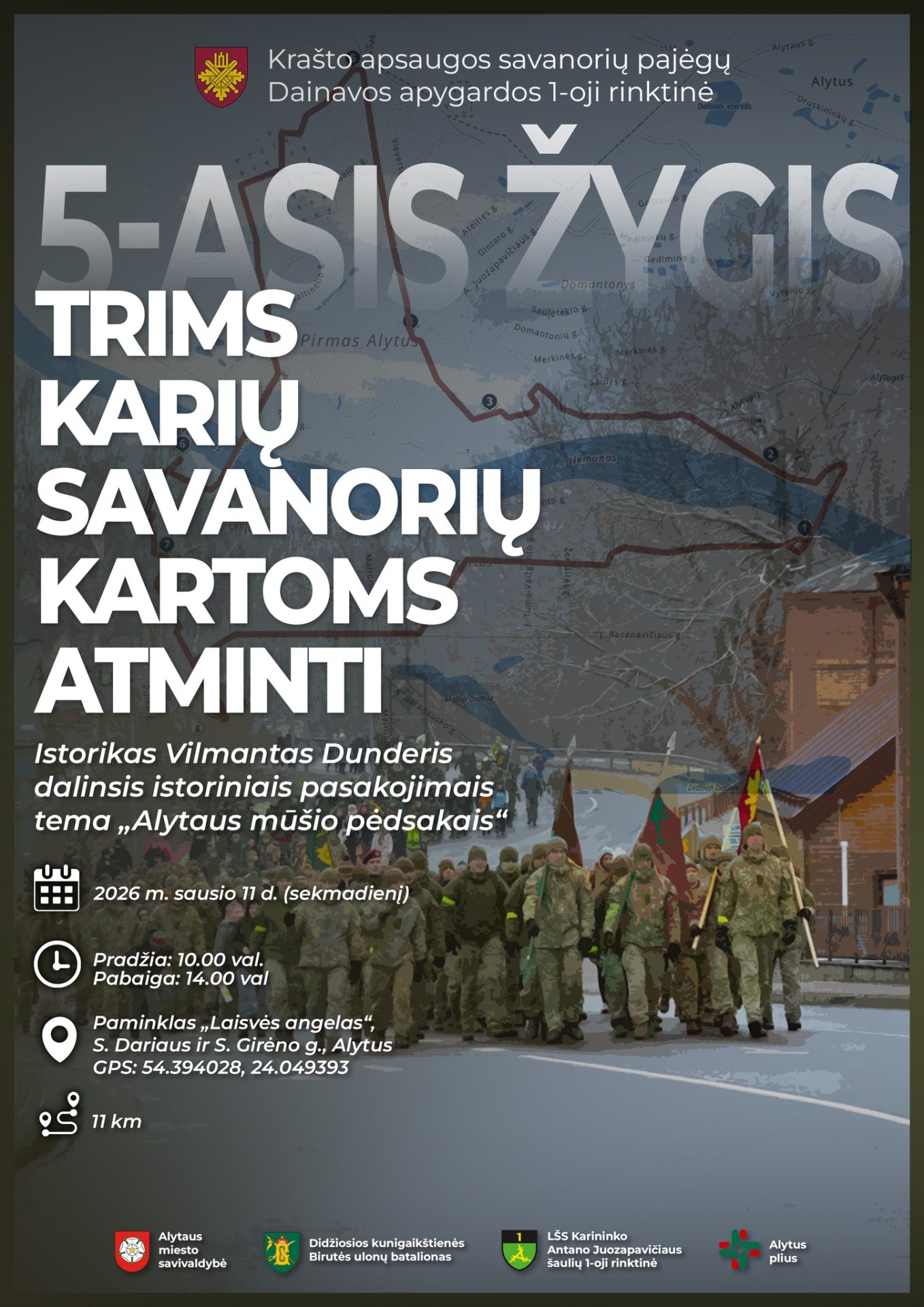 Krašto apsaugos savanorių pajėgų Dainavos apygardos 1-oji rinktinė kviečia į 5-ąjį žygį „Trims karių savanorių kartoms atminti“.