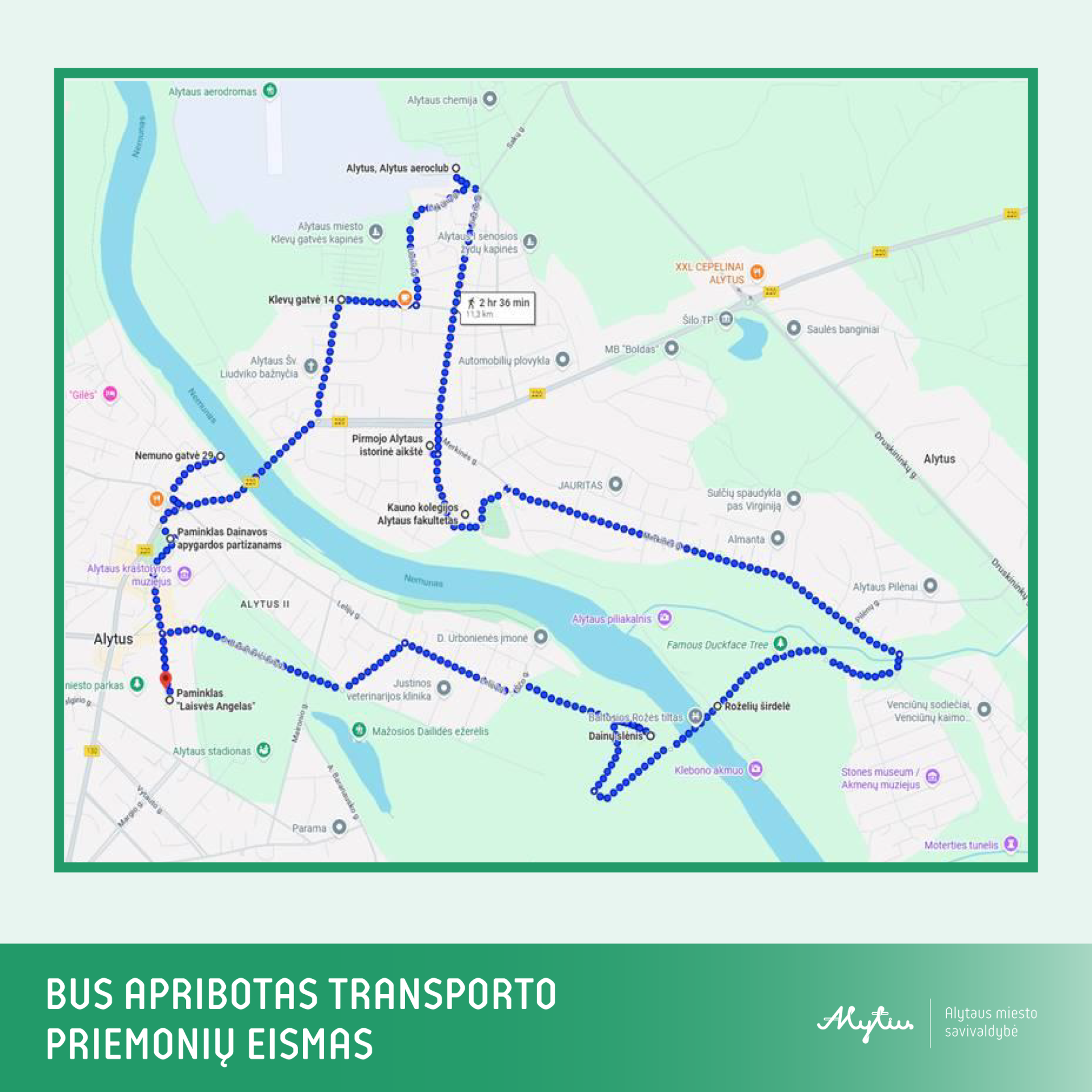 aikštė prie Laisvės angelo paminklo (S. Dariaus ir S. Girėno g. 25)–Mažosios dailidės ež.–J. Basanavičiaus ir V. Krėvės gatvių sankryžos–Lelijų g.–Dainų slėnis–Baltosios rožės pėsčiųjų tiltas–pėsčiųjų takas–sodų bendrija „Nemunas“–Merkinės gatvė–Kauno kolegijos Alytaus filialas–pėsčiųjų takas–A. Juozapavičiaus tiltas–Kauno ir Nemuno gatvių sankirta–Alytaus prieplauka (Nemuno g.)–paminklas Dainavos apygardos partizanams (skveras prie Alyvų tako)–aikštė prie Laisvės angelo paminklo.
