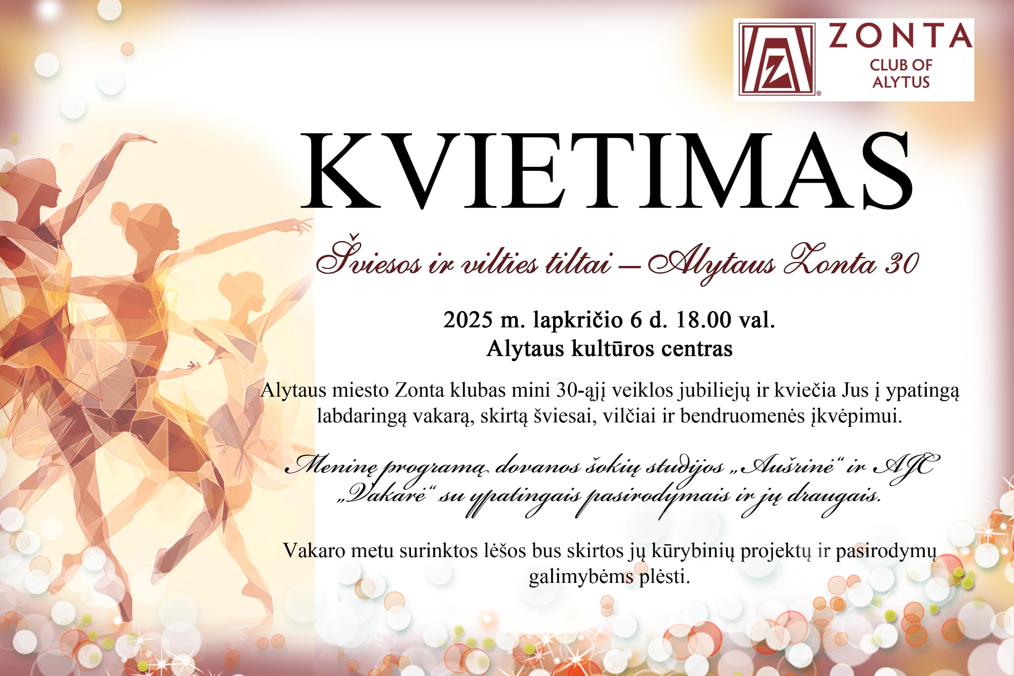 Minėdama 30 metų veiklos sukaktį, „Zonta” alytiškius kviečia į išskirtinį labdaros vakarą, skirtą šviesai, vilčiai ir bendruomenės įkvėpimui. Vakaro metu pasirodymus dovanos šokių studijos „Aušrinė“ ir Alytaus jaunimo centro šokių studija „Vakarė“, kartu su ypatingais svečiais ir draugais.